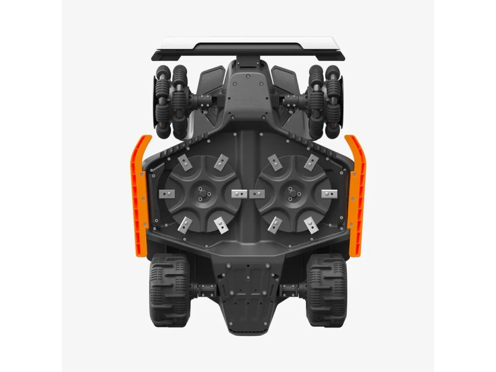 Unikátní systém dvou žacích disků (celkový záběr 400 mm) je vybaven celkem šesti břity (noži) pro dokonalý střih a mulčování. Výkonné 165W motory spolu s Vision AI automaticky upravují otáčky (2700–3000 RPM) podle hustoty trávy.
